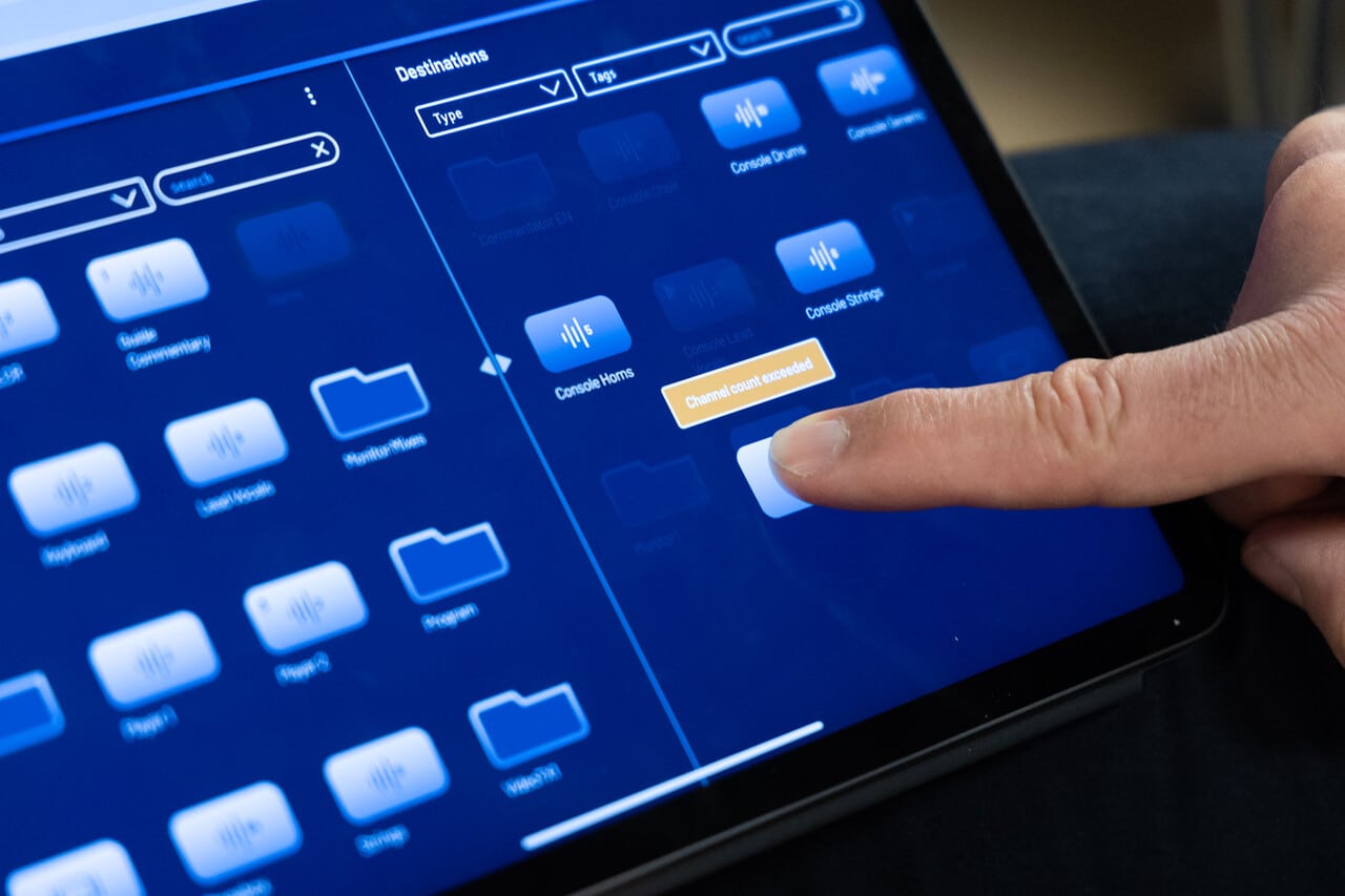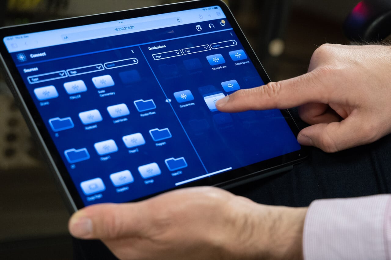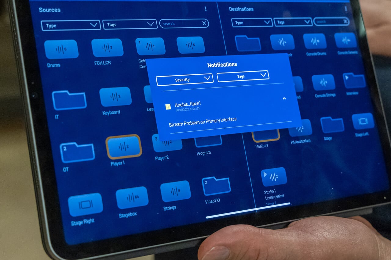 Das Interface ist entsprechend klar und einfach gestaltet, als Weboberfläche. Es gibt Quellen und Senken, die in Ordnern und mit Tags strukturiert werden können. Klare Symbole machen erkennbar, ob es sich um eine Audio- oder Videoquelle handelt. Per Drag and Drop werden Quellen mit Senken verbunden. Hierbei unterstützt die Programmierung, indem sie im Drag and Drop Vorgang nur die Senken zulässt, die für die ausgewählte Quelle auch infrage kommen. Der Rest wird ausgegraut. Signale können einzeln und in Gruppen geroutet werden. Die Verbindung einer 64-Kanal Stagebox mit einem 64-Kanal Mischpult ist ein einem Wisch erledigt.