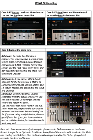 Am 6. 2. 2020 erschien die Wing Firmware 1.02.Eine der größten Erweiterungen: Die versprochenen Effekte des TC Electronics VSS3 Reverb wurden integriert. Einmal kann er eine Fülle von Effekt-Presets aufrufen, diese sind dann aber auch in vielen Einzelparametern erditierbar.Außerdem läuft nun auf dem Front-USB zusätzlich ein 4-Kanal Recorder-Player (wenn mit FAT32 formatiert). Das Kanal-Delay wurde durch Code-Optimierungen auf bis zu 8 m (23,3 ms) erweitert. Unterstützt wurden nun nicht nur die Apps Wing Copilot und Mixingstation, sondern auch die Midas I/O Boxen DL251, DL15x, DL231.