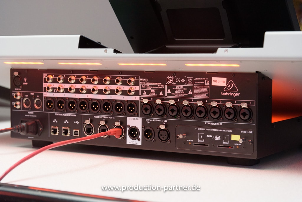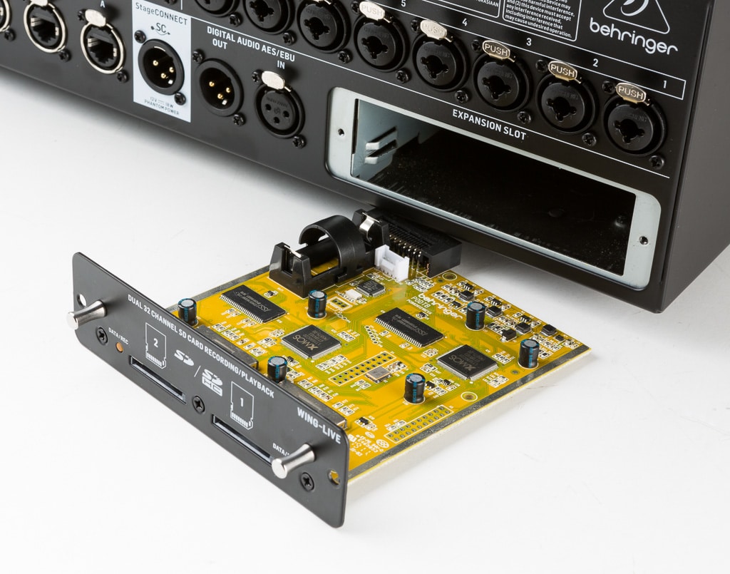 Für das Recording auf SD-Karten stattet Behringer das Pult mit der Einschubkarte Wing-Live aus: Audio mit 48 kHz / 32 Bit auf zwei SD-Slots zur Verdopplung der Spuren auf 64 (ab der Firmware 1.06 auch samplesynchron). Auf ein gleichzeitiges Playback muss dabei nicht verzichtet werden (32 play, 32 rec). Auf der Pult-Front gibt es den gewohnten USB-Port, der aber jetzt sogar vier Spuren (z. B. für Click-Tracks) abspielen kann. Zusätzliche Sicherheit im Recording bei Stromausfällen verschafft eine optional auf der Karte einsetzbare Puffer-Batterie (incl. Clip gegen Herausfallen). Das USB 2.0 Audio/MIDI-Interface erlaubt 48 × 48 CH Recording/Playback. Der interne Player kann nun auch Ausschnitte nur zwischen Markern abspielen oder loopen.