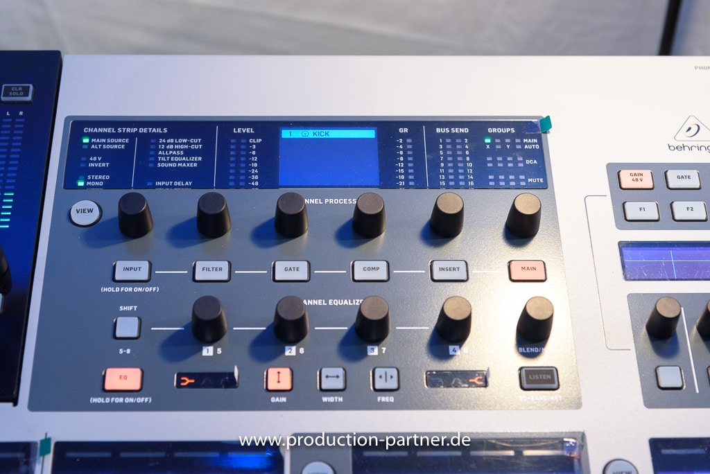 X32-User werden sich etwas umgewöhnen müssen, was die Anordnung der elf EQ-/Dynamics-Regler rechts vom Main-Display angeht. Flankiert werden sie jedoch von einem eigenen, kleinen LCD-Display, das unabhängig vom Haupt-Touchscreen Status-Infos (ist L/R geroutet , Input-Level, Gain-Reduction usw.) oder den Verlauf des EQs anzeigen. Touch auf den Regler visualisiert dessen Funktionen, kurzer Tap auf den Schalter wechselt Funktionen durch, langer Tap deaktiviert z. B. den Compressor – darauf muss man erst mal kommen und sich eingewöhnen. Die untere Reglerreihe ist auf die EQ-Bänder gelegt.