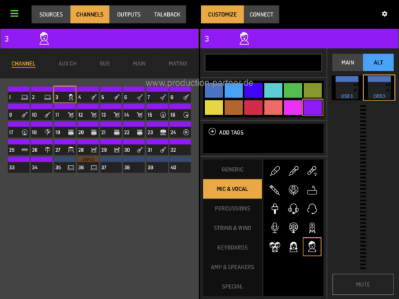 Ein zusätzlicher Mute direkt am Headamp sichert zudem, dass beim Patching nix schiefgeht, beispielsweise beim Zuschalten von 48 V aktiviert er sich automatisch. Weitere sehr moderne Idee: Quellen können mit mehreren Begriffen/Tags versehen werden. Über die Tags lassen sich dann z. B. Mute-Gruppen oder DCAs definieren. Ein DCA-Spill (Aufruf der im DCA zusammengefassten Kanäle) ist derzeit nicht realisiert, aber künftig nicht ausgeschlossen.