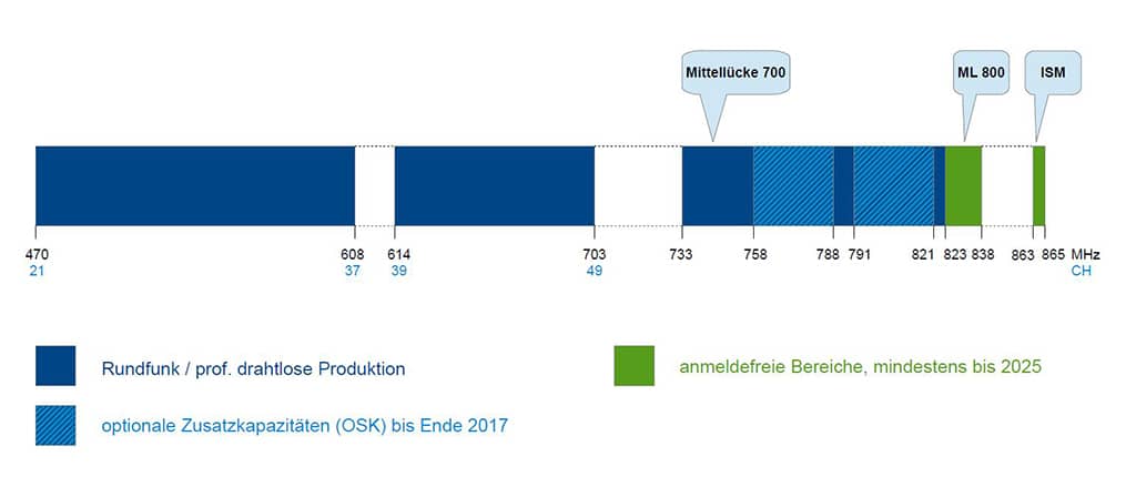 Man geht aber davon aus, dass die Frequenzsegmente 703 bis 733 MHz und 758 bis 788 MHz dem Mobilfunk zugewiesen werden. Inwieweit hier dann die Nutzung von Drahtlosmikrofonen auf sekundärer Basis zukünftig möglich sein wird, ist abzuwarten. Es steht weiter noch die Frage im Raum, ob Frequenzsegmente ab 694 MHz auch den Sicherheitsbehörden oder der Bundeswehr zugewiesen werden.