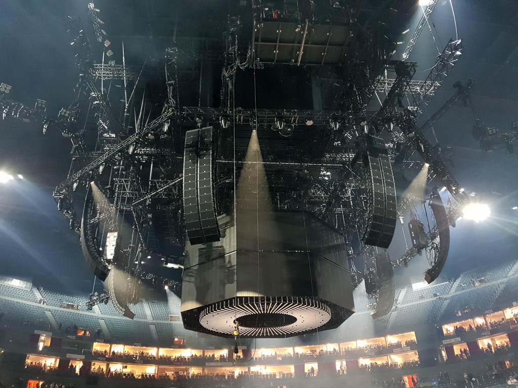 Wer schon einmal in der Kölner Lanxess Arena stand, der weiß, wie groß diese Halle ist. Wenn man jetzt in dieser riesigen – und während des Aufbaus natürlich auch noch leeren – Halle steht, und man trotzdem das Gefühl hat, dass das riesige Rigg über der Center Stage bereits die komplette Halle vollständig ausfüllt … dann kann man sich in etwa vorstellen, wie monströs das Konstrukt aus Licht, Ton und Videotechnik ist, was da an der Hallendecke hängt.