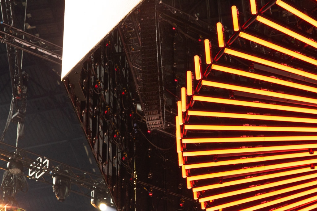 Konkret hieß das für das Bühnendesign: Zwei 360°-Achtecke aus LED-Wänden, die knapp übereinander angebracht waren und so den Anschein einer großen LED-Wand erweckten. Da diese aber auch unabhängig voneinander gefahren werden sollten, mussten die LED-Wände sehr leicht sein. Hier kamen insgesamt 225 Galaxia WinVision LV9 Elemente mit einem Gewicht von 7,7 kg pro Element und einem Pixelabstand von 9,375 mm (SMD) zum Einsatz.