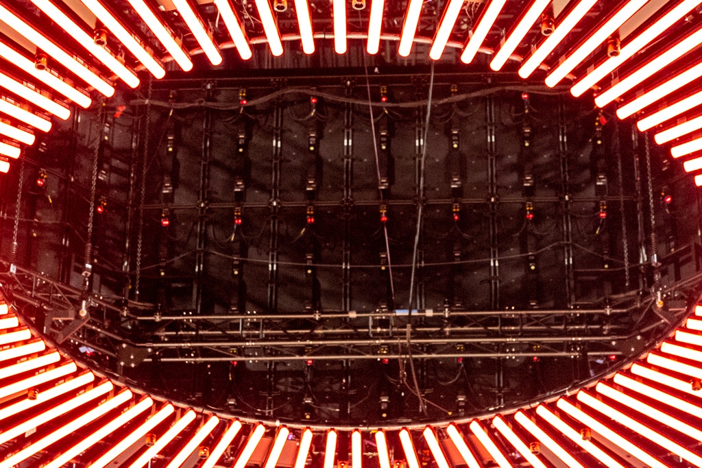 MillimeterarbeitEin Blick durch die Mitte des Coins auf die Rückseite der LED-Wände zeigt, wie das Problem der Aufhängung gelöst wurde: Die Kettenzüge der unteren und oberen LED-Wand mussten eng nebeneinander geführt werden. (Bild: Lena Voss)