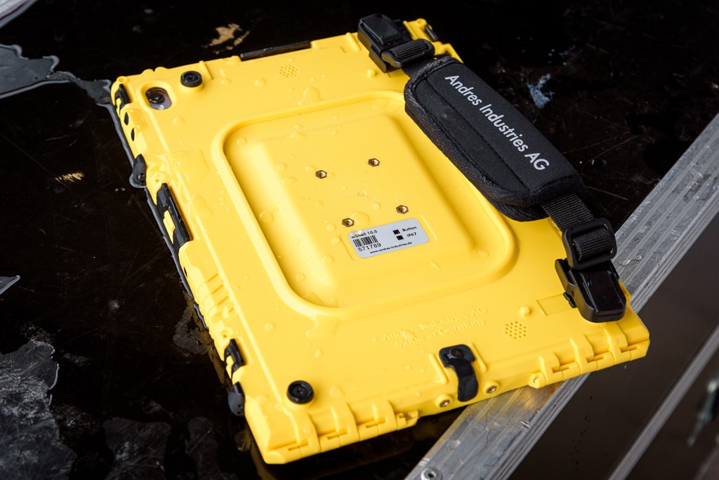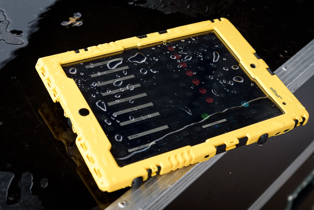 Computer am FOH? Früher undenkbar, alles viel zu instabil und empfindlich. Heute ist der Computer der FOH. Etwas gereift und erwachsen, aber doch schutzbedürftig. In Form von Tablets geht es dann oft aus dem Housing eines Front- oder Monitorplatzes heraus: Pegel einstellen, Rigging-Werte aus- lesen usw. Je nach Barometer-Ausschlag ins eine oder andere Extrem erwarten den Veranstaltungstechniker und sein Tablet dann staubige Wüstenhitze oder norddeutsch-schauriges Schmuddelwetter. Nun sind dem Veranstaltungsverlauf je nach Witterung Grenzen gesetzt, die Aufbau-, Sicherungs- und Servicearbeiten laufen aber uneingeschränkter weiter. Gut, wenn dann das teure Tablet nicht gleich mit absäuft. Noch besser, wenn es sich sogar irgendwo sicher fixieren lässt. Wir casen ja gerne alles im Flightcase ein, beim Tablet sind dann aber doch Grenzen des Casebauers erreicht. Diesem Zweck dient die Aishell-Serie von Andres Industries in sechs Varianten für diverse iPad-Modelle (wir haben hier ein Modell für das 10,5″ iPad Pro ausprobiert und abgebildet). Für den Musikereinsatz (da hat jeder sicher auch schon ein Tablet vom Notenständer fliegen gesehen) ist es wohl aber etwas zu rabiat gestaltet – man sieht ihm an, dass es eher für den Einsatz von Kurierdiensten, Rettungsdiensten usw. designt wurde.