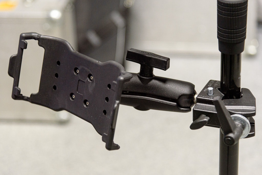 Und zweitens: Es gibt eine Menge Zubehör, das sich vor allem an dem Montagematerial des Herstellers RAM orien- tiert. Diese Halterungen gibt es für fast jeden denkbaren Montagepunkt, beliebt sind sie z. B. bei Sportfliegern und Motorradfahrern. Entweder schraubt man über eingelassene Gewinde im Case ein Kugel-Gegenstück direkt an die Case- Rückseite, oder nutzt den Quicksnapper, der das Case sicher greift – wobei wir das „Quick“ im Namen beim Einsetzen in den strammen Halter nicht ganz bestätigen können. Einmal eingeklemmt, kann der Veranstaltungstechniker aber garantiert Bühnen-Loopings fliegen, ohne dass sich das Tablet löst. Zwischen Case und Montagepunkt kommt dann ein verstellbares Mittelstück, in diversen Längen und auch verschließbar. In unserem Beispiel haben wir als Montagefuß eine RAM-Kugel mit Gewinde an eine Super Clamp geschraubt. Wenn man an ein so montiertes Tablet stößt, holt man sich eher blaue Flecken als dass es herunterfällt.