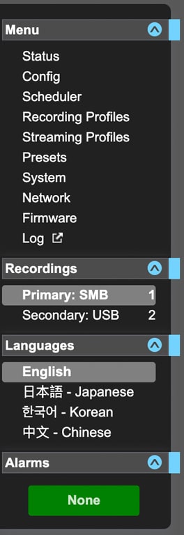 Die Status-Seite liefert uns eine aufgeräumte Übersicht über alle Einstellungen und Gerätezustände. Hier findet sich auch die Adresse für HLS-konfigurierte Streams, insofern der Stream denn gerade läuft. Diese Adressinformation wäre zusätzlich im Streaming-Profil auch gut aufgehoben. Vor dem Starten von Streaming und Recording und auch während des Betriebs ist die Status-Seite der beste Ort, um beispielsweise Speicherkapazitäten und Laufzeiten im Blick zu behalten.