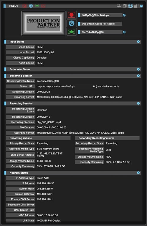 Die Bedienung ist intuitiv und übersichtlich realisiert. Das Manual erklärt nicht nur die Gerätefunktionen, sondern bietet auch weiterführende Informationen zum Betrieb mit bekannten CDN-Anbietern oder auch Konfigurationshilfen, wenn man einen HELO-Stream in Softwarelösungen wie Wirecast einbinden will. Das macht eine Einrichtung des HELO einfach und schnell. Wer individuelle Systemintegrationen benötigt, kann den HELO über die REST-API in Mediensteuerungen und eigene Systeme einbinden. Dank der REST-API finden wir den HELO auch in der Companion-Bibliothek wieder.