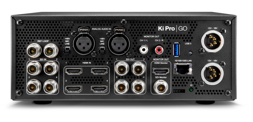 Um eine sofortige Verwendung des Materials möglich zu machen, werden anstatt der bisherigen Ki Pro SSD-Festplatten fünf frei zuweisbare USB 3.2 Ports verbaut. Aufgenommen werden kann damit auf handelsübliche FAT- oder EXFAT-formatierte Speichermedien. Allerdings eben im komprimierenden Format H.264 und nicht wie gewohnt in Apple ProRes. Als mögliche Inputs kommen vier SDI- oder ebenso viele HDMI-Eingänge mit eingebetteter Tonspur und seit Firmware 1.5 auch möglichem Timecode nach SMTPE RP-188 in Frage. Linearer Timecode kann auch über den analogen Audio-Eingang eingespeist werden.