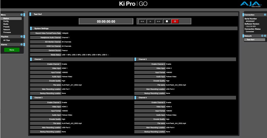 Das Web Interface ist im Stil der Vorgänger gehalten. Bei Benutzung mehrerer Ki Pros in einer IP-Range kann in einem Tab unter den Maschinen ausgewählt werden. In dieser Konfiguration ist auch das Gang-Recording verfügbar, welches mehrere Ki Pro Go mit nur einem Befehl zur Aufnahme animiert. USB-Speichermedien lassen sich mit aktueller Firmware direkt an der Maschine formatieren und die aufgezeichneten Clips können remote direkt über das Webinterface vom Ki Pro Go geladen werden. Außerdem ist die Einbindung eines SMB Netzlaufwerkes möglich, was die Recordings direkt mit Abschluss der Aufnahme verfügbar macht.