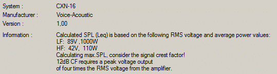 Das Infofenster der GLL lieferte für den Lautsprecher dazu folgende Informationen: Der für den Test verwendete Verstärker, ein HDSP-6A, bestückt mit zwei Modulen X-Pro3 von Pascal Audio, liefert an 8 Ω eine maximale Ausgangsspannung von 160 Vpk. Für ein Signal mit 12 dB Crestfaktor entspricht das einem Effektivwert von 40 Veff. Das bedeutet in der Praxis: für den Hochtöner werden bei einem 12 dB Crestfaktor-Signal die für die Berechnung angenommenen 42 Veff auch nahezu erreicht – für den Tieftöner die 89 Veff jedoch nicht. Die Abstriche, die deswegen zu machen wären, würden rein rechnerisch betrachtet fast 7 dB betragen. In der Praxis sind die Auswirkungen jedoch nicht ganz so heftig, da der Crestfaktor des Signals für den Tieftöner durch die Filterung reduziert wird und bei maximal 10 % Gesamtverzerrung auch eine gewisse Kompression zulässig ist.