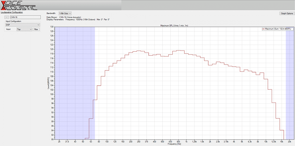 Wie heute üblich, gibt es auch für die CXN-16 Simulationsdaten. Diese liegen in mehreren Formaten vor: Im aktuellen EASE GLL Format, im alten EASE SPK und als CLF-Daten. Sie können somit in allen aktuellen Simulationsprogrammen genutzt werden. Die exaktesten Informationen liefert die EASE GLL (Generic Loudspeaker Library). Abb. 8 zeigt dazu den Frequenzgang aus der GLL. Die Auflösung beträgt maximal 1/24 Oktave. Auch wenn man keine Simulationen berechnen möchte, kann man sich mithilfe des kostenlosen GLL-Viewers von AFMG Berlin die GLL-Daten mit allen Informationen zur Directivity und vor allem auch zum Maximalpegel anschauen.