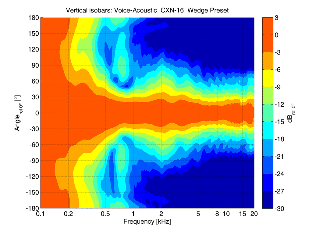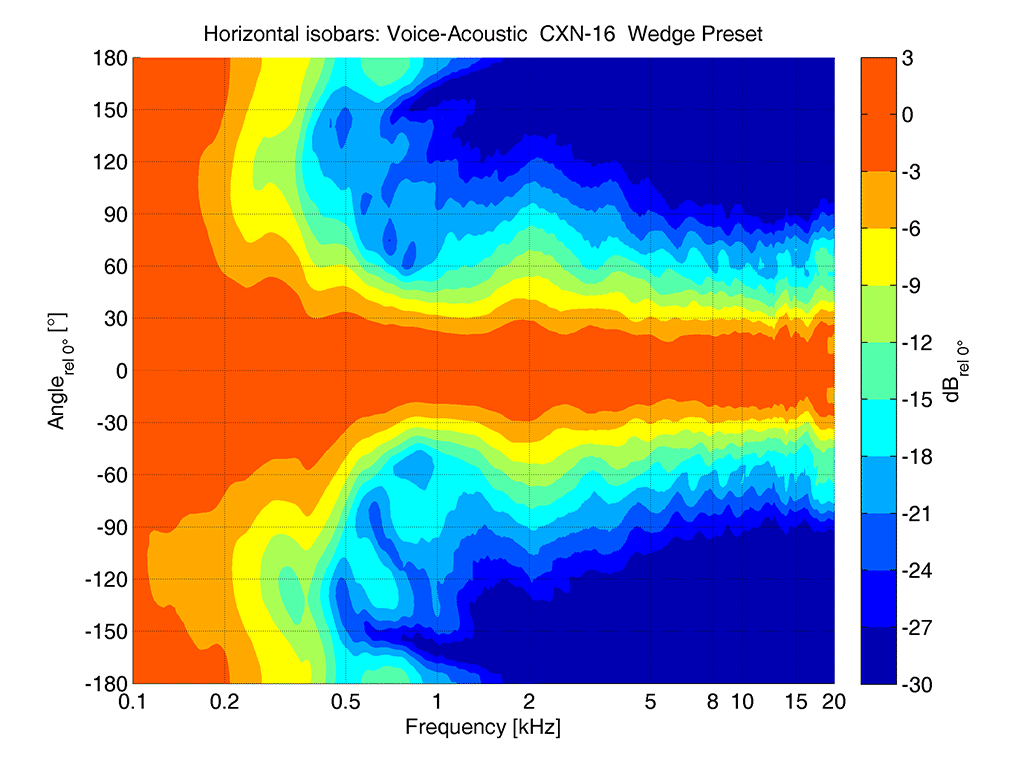 In der Isobarengrafik sind jetzt alle Polarmessungen für alle Frequenzen in dieser Form nebeneinander von den tiefen (100 Hz) bis zu den höchsten Frequenzen (20 kHz) aufgereiht. Das Isobarendiagramm liefert damit einen kompletten Überblick über alle Winkel der betreffenden Ebene für den gesamten Frequenzbereich. Die eigentlichen Isobaren sind die Grenzlinien des Farbwechsels. Der Übergang von orange nach gelb bedeutet einen Pegelabfall gegenüber der Hauptachse von 6 dB. Genau das ist auch der Wert, der typischerweise als „nomineller Abstrahlwinkel“ angegeben wird. Wie sich in Abb. 9 erkennen lässt, ist der −6 dB-Öffnungswinkel für ganz tiefe Frequenzen zunächst sehr groß und schnürt sich dann zügig ein. Ab ca. 750 Hz aufwärts nähern sich die Isobaren einem geradlinigen Verlauf an. Der als nomineller Abstrahlwinkel angegebene Wert ist daher meist ein Mittelwert für einen mittleren bis hohen Frequenzbereich, wo der Abstrahlwinkel weitgehend konstant ist, d. h. wo die Isobaren parallel zu den Winkellinien verlaufen. Für die Isobaren aus Abb. 9 könnte man so einen Wert von ±30° (60° insgesamt) oberhalb von 750 Hz als Mittelwert der −6 dB-Linie angeben, so wie es auch im Datenblatt der CXN-16 aufgeführt ist. Die Bezeichnung horizontal und vertikal bezieht sich hier auf eine Positionierung der Box als „normales“ Topteil. Als Bühnenmonitor quer liegend betrieben vertauschen sich die beiden Ebenen. Dann wird aus dem 60 × 40 Topteil ein 40 × 60 Monitor. Die Isobaren der 40° Ebene sind in Abb. 10 dargestellt. Die nominellen 40° können hier nicht ganz eingehalten werden. Bis ca. 4 kHz sind es noch 60° und darüber hinaus werden dann die 40° erreicht.