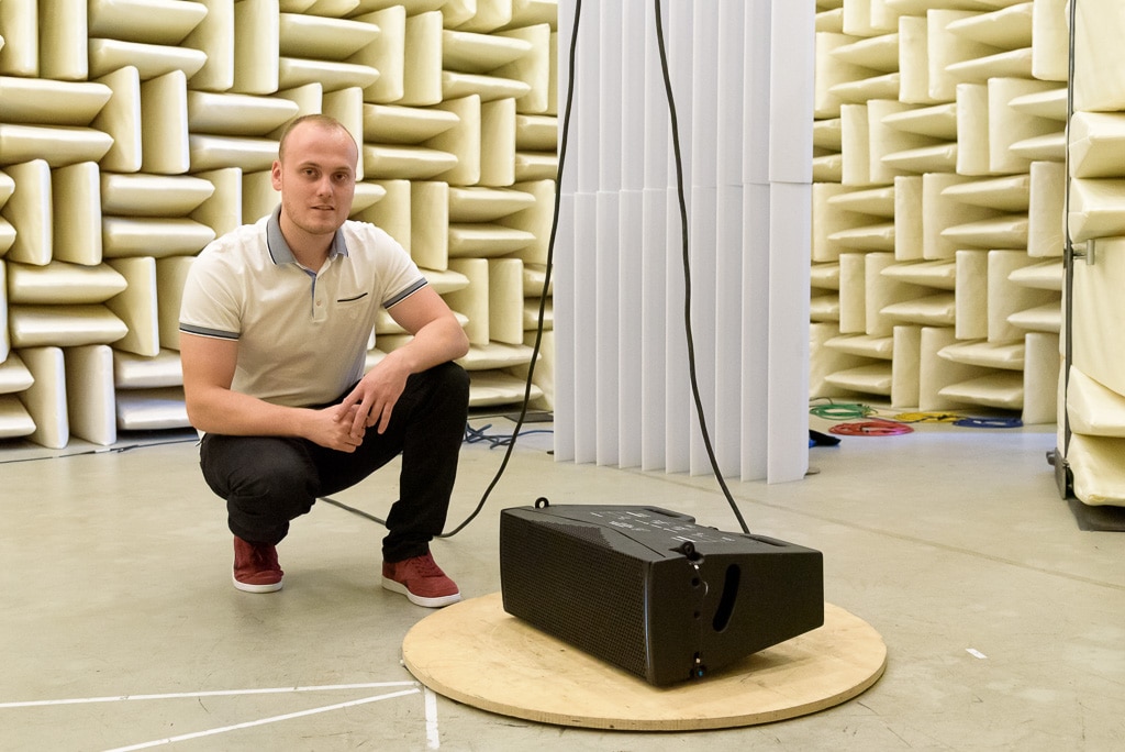 Vorserienmodell des SB118im reflexionsarmen Raum, das Gehäuse ist als Bandpass konstruiert (Bild: Anselm Goertz)
