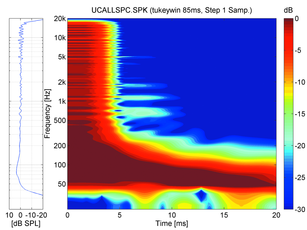 Im Spektrogramm aus Abb. 12 stellt sich das UC-System insgesamt gutmütig dar. Einige kleine Resonanzen in den Mitten lassen sich jedoch nicht ganz verleugnen. Die Konstruktion mit dem Bandpassresonator vor den Tieftönern und dem komplexen Waveguide fordern eine kleinen Tribut.