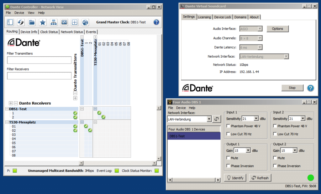 Dante Controller mit Zuordnung der Ein- und Ausgänge (links), rechts oben die Dante Virtual Soundcard als Schnittstelle für den Audio-Precision-Analyser zum Dante-Netzwerk. Rechts unten die Konfigurationssoftware für die Dante Breakout Box (Abb. 1) (Bild: Anselm Goertz)