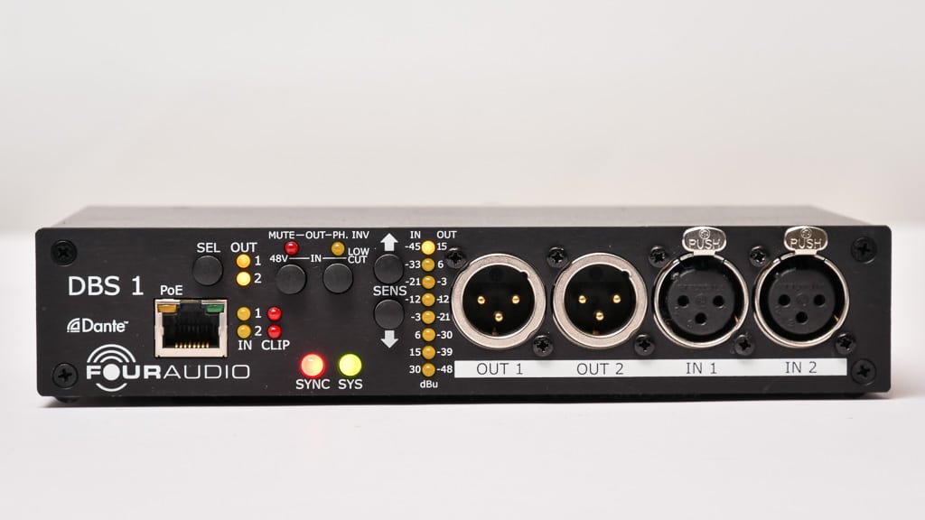 Gehen wir unsere Messungen und Eckdaten einmal exemplarisch an einem einfachen Gerät mit 2-In/2-Out durch – dem DBS1 von Four Audio. Das DBS1 bietet auf Basis des Dante-Ultimo-Moduls je zwei analoge Ein- und Ausgänge. Die Eingänge sind mit Preamps und 48 V Phantomspeisung ausgestattet und können in 3-dB-Schritten in ihrer Sensitivity von −45 dBu bis +30 dBu eingestellt werden. Die Ausgänge liefern einen Ausgangspegel von maximal +15 dBu. Die Stromversorgung des DBS1 kann entweder über ein externes 5- Volt-Netzteil erfolgen oder via PoE. Die PoE-Stromversorgung ist vor allem dann praktisch, wenn das DBS1 als unkomplizierter Zugang zum Dante-Netz genutzt werden soll.
