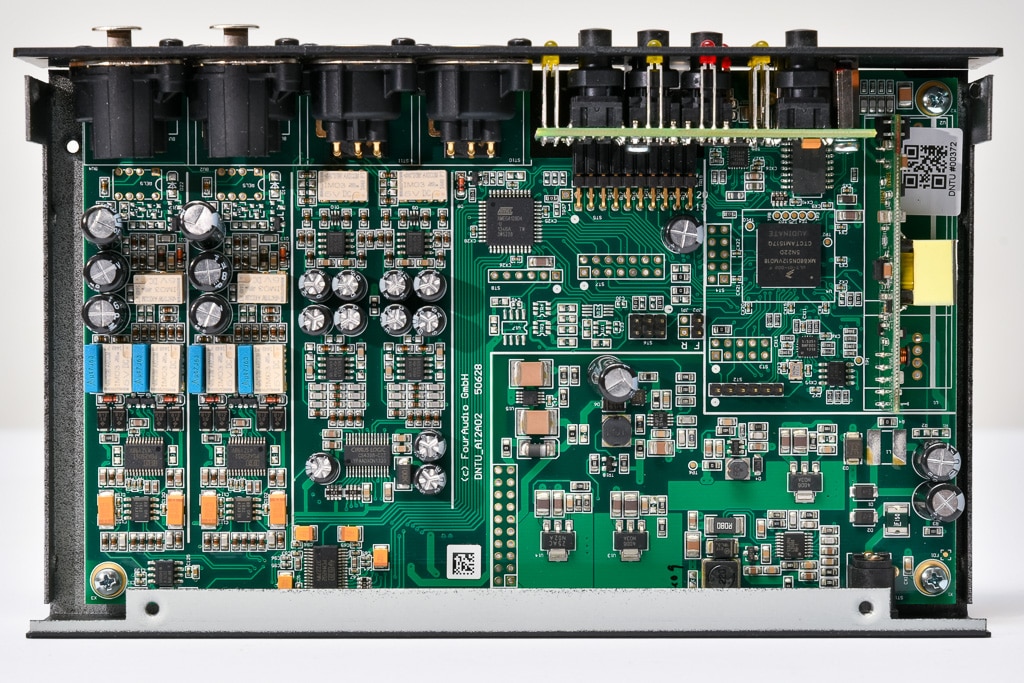 Breakout-Box-Innenansicht ganz links im DBS1 die Preamps mit digital steuerbaren Vorverstärkern Texas PGA2505, rechts davon ein 2-kanaliger Texas PCM4202 AD- und ein ebenfalls zweikanaliger DA-Wandler Cirrus Logic CS4398. Rechts oben als quadratischer Baustein der Dante-Ultimo-Chip (Bild: Anselm Goertz)