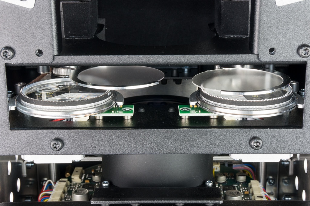 Gobo- und Animationsräder können fast über den gesamten Bereich des großzügigen 1:8 Zooms von 7° bis 56° scharf abgebildet werden – lediglich bei engabstrahlenden Beams muss der Schärfe mit etwas Zoom nachgeholfen werden. Zukünftig soll hier auch noch ein Autofokus-System implementiert werden, das eine eingestellte Schärfe einem bestimmten Algorithmus folgend nachführt.