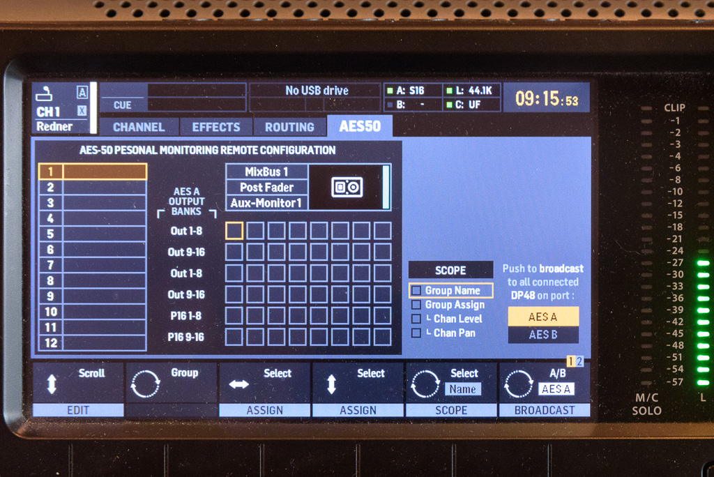 Eine weitere Unterstützung betrifft den neuen Monitor-Mixer Midas DP48 (48 CH auf 12 Stereo-Gruppen und zwei Stereo-Mixe). Die grundsätzliche Idee des R&D: es sollte doch langsam anwenderfreundlicher werden, Signalroutings – wie zwischen FOH und Monitor – aufzusetzen. Hier ist als erster Schritt vorgesehen, dass vom Pult Einstellungen via Firmware 4 per Broadcast an die Personal Monitor Mixer übergeben werden. Wenn man einmal davon ausgeht, dass ein Pultmix auch für In-Ears erst mal keine schlechte Ausgangsbasis ist, hat man mit der einmaligen Übergabe von Level und Pan einen guten Start, statt bei null anfangen zu müssen.
