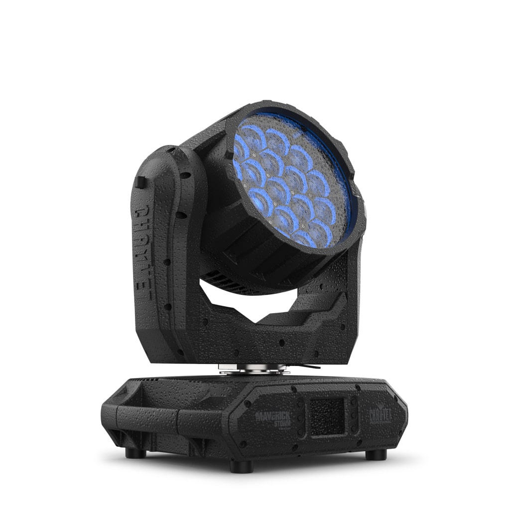Bezüglich Größe und Output bietet der Chauvet Maverick Storm 1 Wash eine solide Performance in einem robusten Kleid. Knapp 26 kg Gewicht bringt der vergleichsweise kleine Scheinwerfer aufgrund seines massiven, IP65-klassifizierten Gehäuses auf die Waage, ein starker Output von 6.000 Lumen ermöglicht dabei gleichermaßen die Nutzung auf Open-Air-Festivals oder architektonischen Anwendungen ohne Angst vor Wetter oder Dreck … Ein homogenes Farbmischsystem, userfreundliche LED-Makros und ein ordentlicher Zoombereich bieten bereits im „Single-Basic-Mode“ breitgefächerte Einsatzmöglichkeiten ohne viel Tamtam, im „Dual-Mode“ lassen sich Grundfunktionen und LED-Matrix komplett getrennt verwalten und erweitern damit die Spielwiese kreativer Gestaltung. Lediglich das Dimming konnte bei unserem Testgerät nicht komplett überzeugen, war es doch je nach gewähltem Modus entweder sehr weich, aber träge, oder schnell und etwas sprunghaft. Der Maverick Storm 1 ist zu einem Listenpreis von 3.990,− € netto bei Chauvet Deutschland erhältlich.