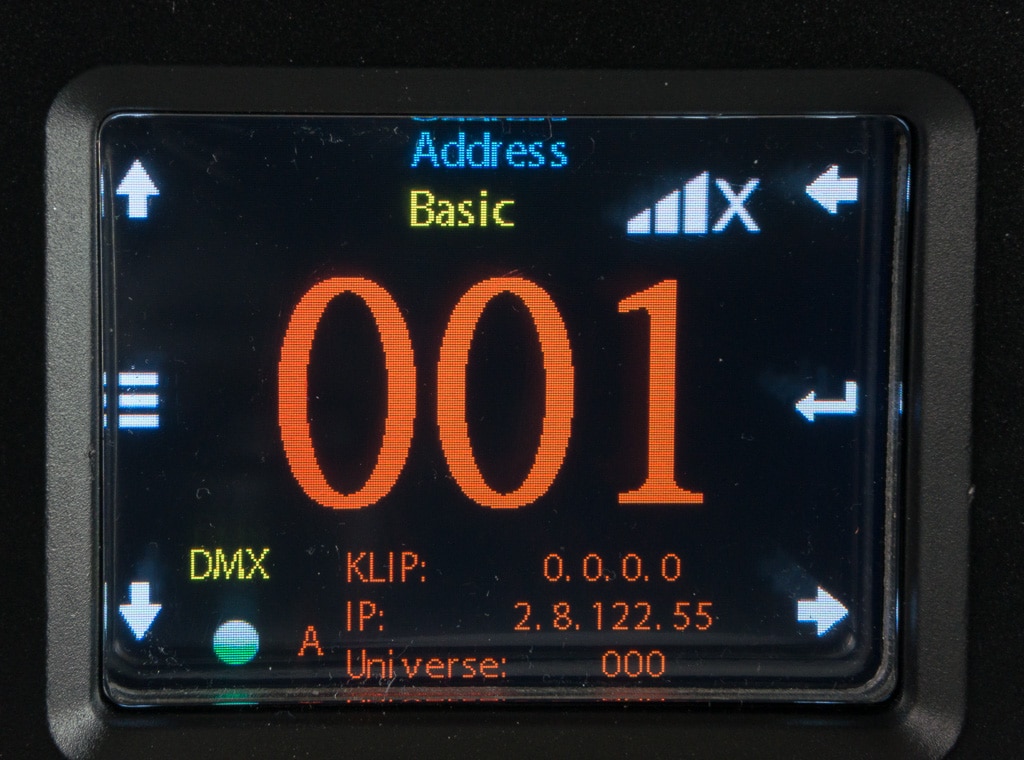 Das Farbdisplay wirkt hinsichtlich Homescreen aufgrund der vielen, bunt dargebotenen Informationen auf den ersten Blick etwas überladen sowie bezüglich Anordnung und Funktion der sechs Menütasten verwirrend. Nach einigen Testdrücken und fehlgeleiteten Reiserouten im Menübaum findet man sich dann aber doch relativ schnell und gut zurecht. Lediglich die hierarchische Struktur des Setups über aufeinander folgende Untermenüs wie „Control Settings – Single/Dual Control – DMX/ArtNet/sACN/WDMX – Personality/StartAddress“ will erst einmal gefunden werden, entbehrt aber nicht einer gewissen Logik. Sehr schön ist hier eine Akkupufferung des Displays – wozu allerdings die linke, mittlere Taste für mindestens sieben (!) Sekunden gedrückt werden muss – sowie eine Auto-Flip-Funktion, die das Display je nach Montage selbstständig in die richtige Richtung dreht.