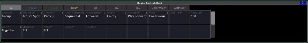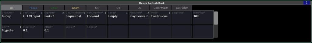 Noch ein Wort zum Device Selects Dock: Das Fenster listet nicht nur die Attribute der Scheinwerfer auf, sondern unterstützt eine extrem praktikable Gestensteuerung auf dem Touchscreen: Da die gleichzeitig zu editierenden Attribute über die vier physikalischen Encoder begrenzt sind, können die Werte nach Anwahl direkt durch ein Verschieben des Fingers nach oben oder unten verändert werden – ein Feature, das man sogar den Gruppen spendiert hat! Wählt man diese über das Direct Selects Dock an – eine vom User definierte Zusammenstellung an Touch-Buttons für die direkte Anwahl von Gruppen, Paletten, Effekten usw. – so lassen sich auch die Intensitäten der enthaltenen Devices mit dem Finger steuern.