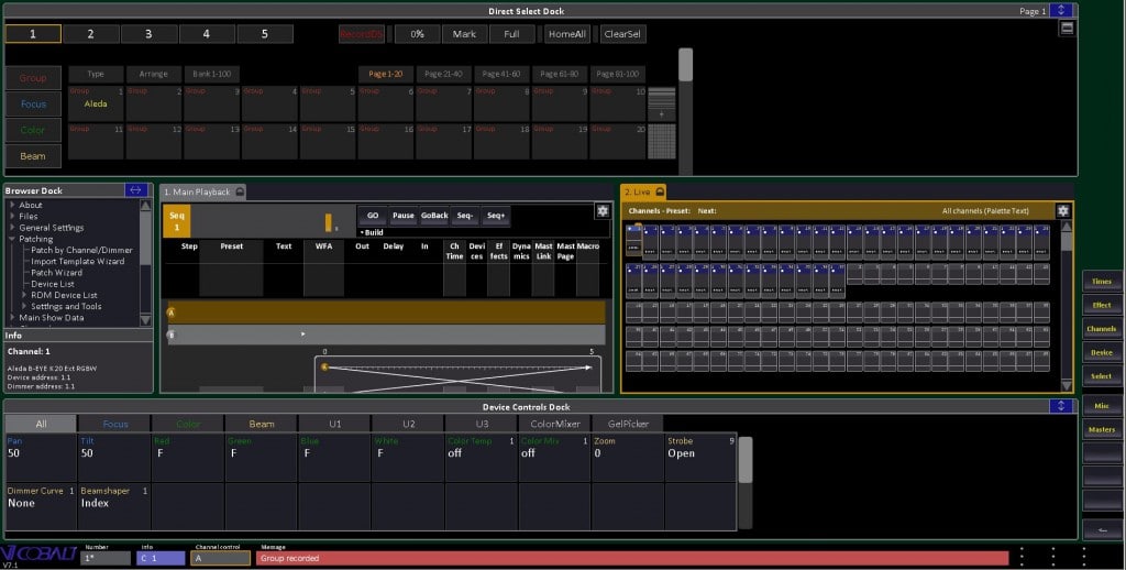 Aber es ist nicht die optisch ansprechende und hochwertig verarbeitete Hardware, sondern die Software, in der sich die Besonderheiten der Cobalt 20 verstecken. Bemerkenswert ist dabei nicht das Vorhandene, sondern das, was im Vergleich zu anderen Konsolen nicht (mehr) findet. Beispielsweise arbeitet das Pult komplett Modeless, also ohne eigene Ebenen für Setup, Programming oder Playback – alles passiert gleichzeitig und ohne jegliche hierarchische Struktur. So ist es möglich, im laufenden Betrieb an Patch und Showfile zu arbeiten, indem lediglich die dafür benötigten Fenster bei Bedarf über Hardkey, Softkey oder zentrale Browseransicht geöffnet und wieder geschlossen werden.