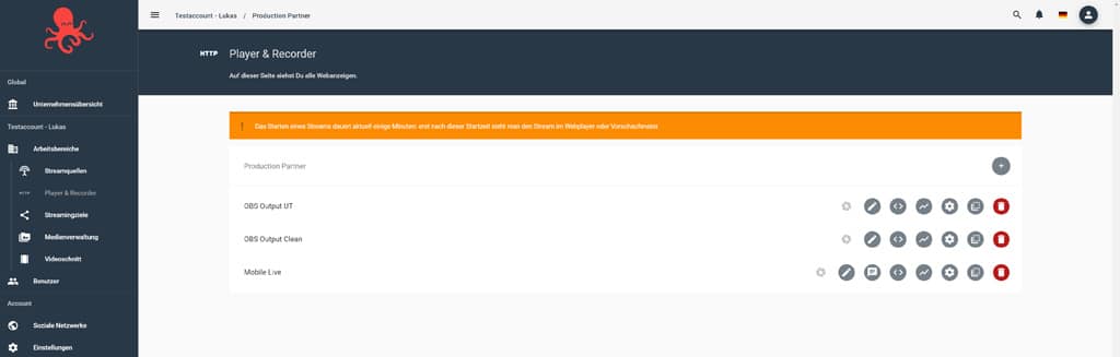 In der Player- und Rekorder-Übersichtkönnen für eingehende Streams sowohl Aufnahmen zur schnellen Bearbeitung als auch Player zur Einbindung auf externen Webseiten erstellt werden (Bild: Contentflow)