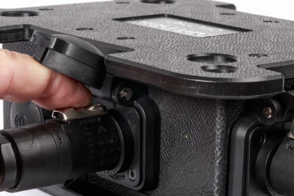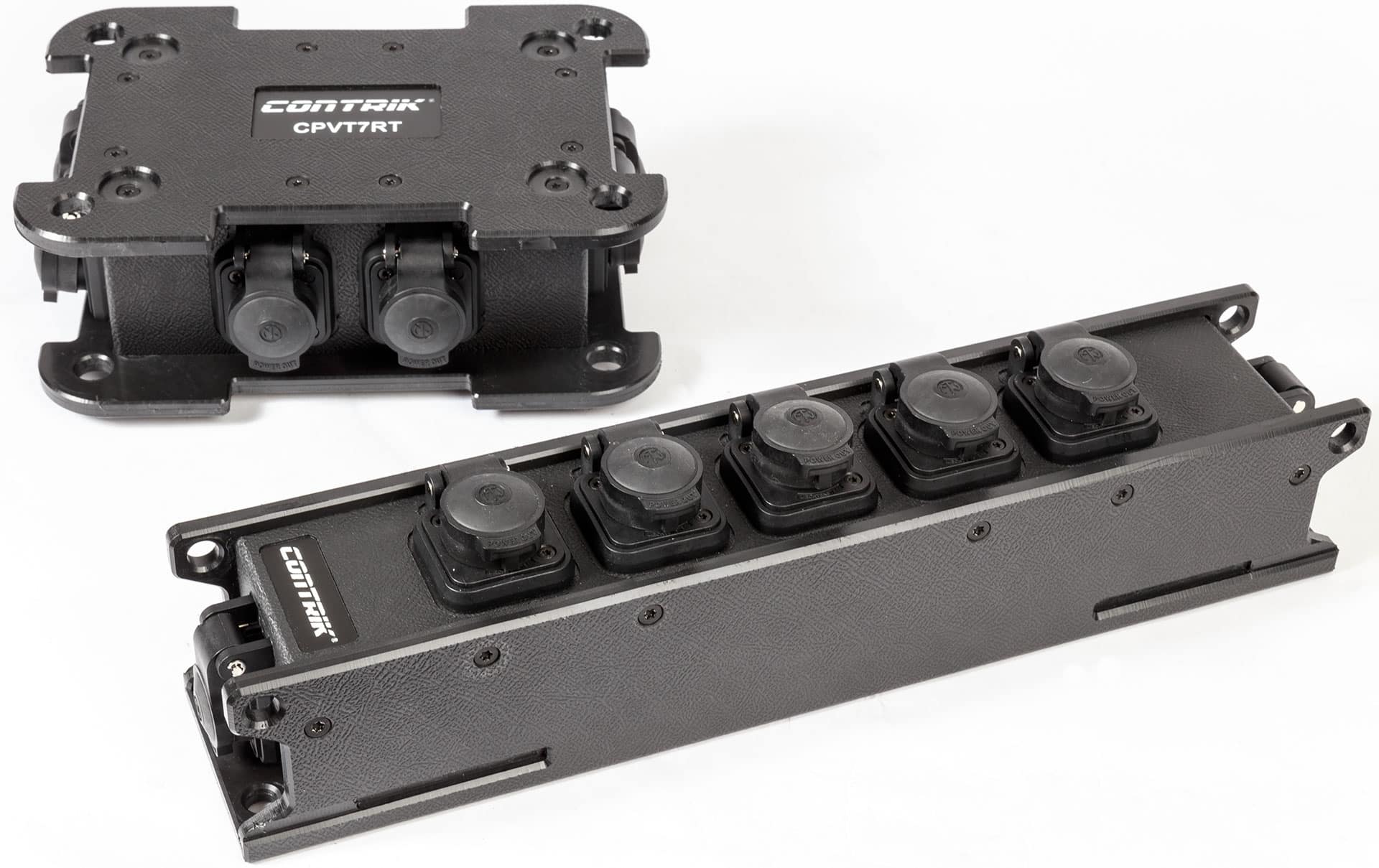 Nun wird dieser Steckverbinder im wahrsten Sinne getoppt, und zwar mit dem Powercon True 1 Top. Mit ihm erhält man einen Steckverbinder, der die Vorzüge des vorher genannten Modells weiterträgt, aber darüber hinaus speziell für Outdoor-Einsätze und extrem rauen Umgang ausgelegt ist. Er ist sozusagen das Herzstück des Contrik-CPVT-Energieverteilungssystem. Er ist mit 16 A belastbar und darf – wie vorher auch – unter Last und Spannung ein- und ausgesteckt werden. Das Material ist UV-beständig und äußerst robust.