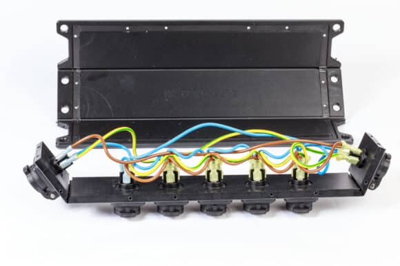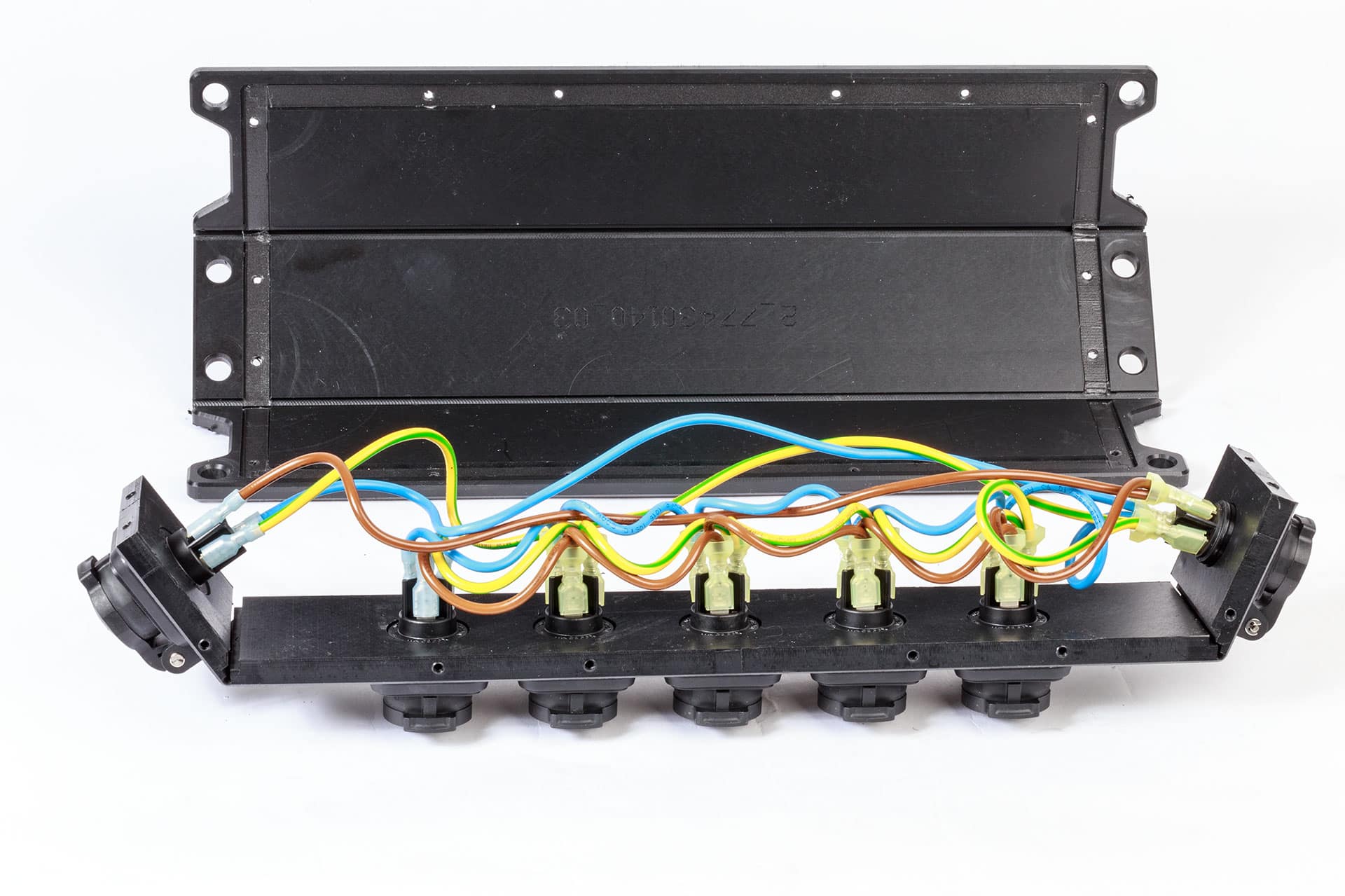 Power Strip XO „aufgefaltet“ Die interne Verdrahtung erfolgt mit Multinorm-Leitungen, die einer erhöhten Anforderung der Amerikaner und Kanadier entsprechen und UL-gelistet sind – vorteilhaft, wenn man seine Verteilung weltweit einsetzen möchte (Bild: Herbert Bernstädt)