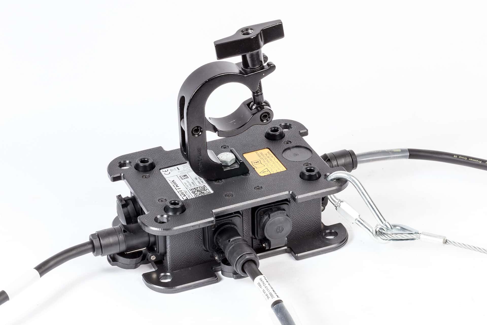 Weiterhin unterscheidet sich der Power Turtle vom Power Strip dadurch, dass bei ihm noch ein M10-Gewinde in die Gehäusebodenseite eingelassen ist. Die Power Strips weisen dafür seitliche Nuten auf, um optional erhältliche Trussclips einzuschieben. Die zweite Trussclip gilt als 2. Halterung, sodass hier auf ein Sicherungsseil verzichtet werden kann. Nebenbei sorgen die Federwirkung und das Aufklemmen auf der Truss dafür, das der Verteiler bei senkrechter Befestigung nicht am Traversenrohr herunterrutscht.