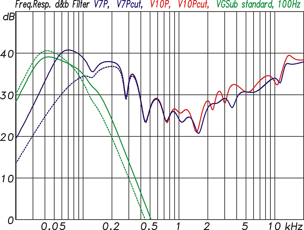 Filterfunktionen für die V7P (blau), V10P (rot) und für den V-GSUB (grün). V7P und V10P unterscheiden sich nur oberhalb von 1 kHz. Gestrichelt jeweils der Cut-Modus für die Topteile. Für den V-GSUB gibt es die Standardeinstellung und den 100-Hz-Modus (gestrichelt) für die Kombination mit Topteilen im Fullrange-Modus (Abb. 3) (Bild: Anselm Goertz)