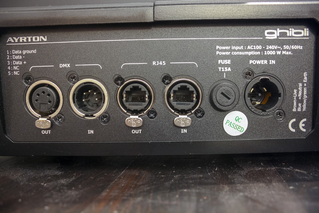 Die Unterseite des Ghibli: hier sind gleich zwei Befestigungsmöglichkeiten für die obligatorische Sicherung gegen Herabfallen des Gerätes sowie vier Gummistandfüße angebracht. Dazu gesellen sich zwei Tragegriffe an den Seiten des Basements als benutzerfreundliche Accessoires. An der Rückseite des Scheinwerferbasements sind die Anschlussmöglichkeiten untergebracht: Im Bereich der Signalverteilung teilen sich diese in zwei fünfpolige XLR-Anschlüsse und zwei EtherCon RJ45-Schnittstellen auf. Dazu kommen der PowerCon-True1-Anschluss und die Halterung für eine Feinsicherung (T15A). Der Ghibli ist nicht mit einem Ein/Aus-Schalter ausgestattet.