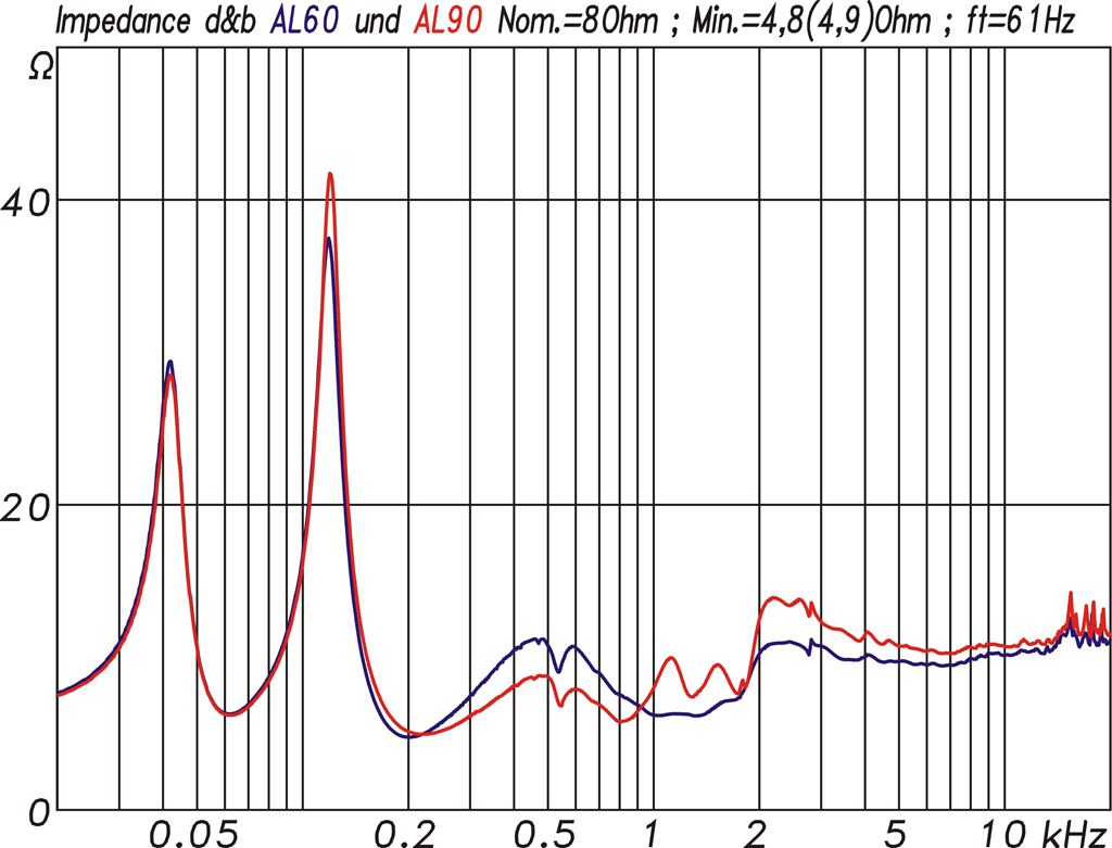 Bei den Messwerten bleiben wir zunächst auf der elektrischen Seite bei der Impedanz (Abb. 1). AL60 und AL90 unterscheiden sich hier nur geringfügig und werden mit einer Nennimpedanz von 8 Ω angegeben. Mit einem Minimum von 4,8 Ω bzw. 4,9 Ω wird der Wert streng nach Norm zwar nicht eingehalten, was jedoch weniger wichtig ist, da d&b- Lautsprecher immer nur mit den zugehörigen Verstärkern zusammen verkauft und betrieben werden, wo sich der Anwender auf einen sicheren Betrieb verlassen kann.