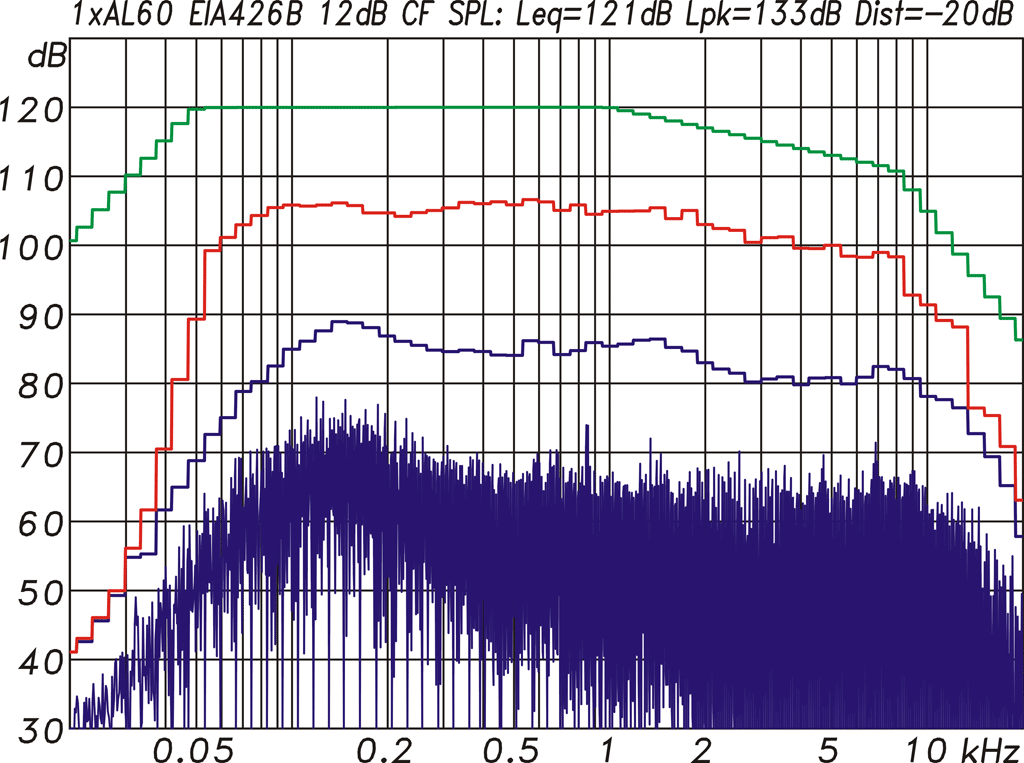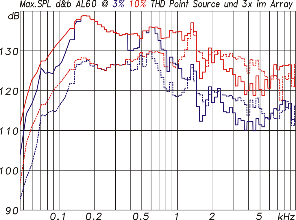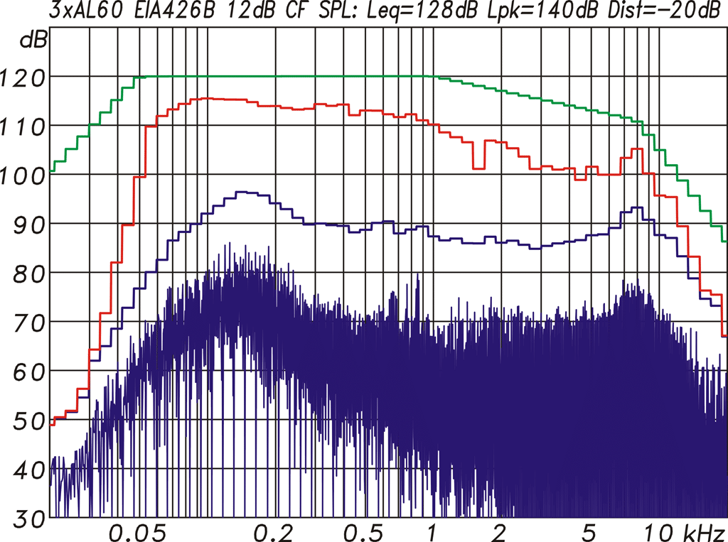Für den aus dieser Art der Messung abgeleiteten Verzerrungswert werden alle Spektrallinien aufaddiert, die nicht im Anregungssignal vorhanden sind, d. h. die als harmonische Verzerrungen oder als Intermodulationsverzerrungen hinzugekommen sind. In der Grafik sind das die blauen Linien und deren Summenkurve in 1/6 Oktav breiten Frequenzbändern. Wichtig ist es dabei zu beachten, die Frequenzen des Anregungssignals so zu generieren, dass sie nicht mit den harmonischen Verzerrungsanteilen zusammenfallen, da sie sonst nicht mehr ausgewertet werden könnten. Auch bei dieser Art der Messung wird der Pegel so lange erhöht, bis der Gesamtverzerrungsanteil (TD = Total Distortions) einen Grenzwert von 10% erreicht. Bei den Gesamtverzerrungen werden alle harmonischen Verzerrungsanteile (THD) und auch die Intermodulationsverzerrungen (IMD) berücksichtigt. Unter diesen Bedingungen erreichte eine einzelne AL60 für ein typisches Musikspektrum nach EIA-426B bezogen auf 1 m Entfernung im Freifeld unter Vollraumbedingungen einen Spitzenpegel von 133 dB und einen Mittlungspegel von 121 dB. Ein 3er-Array mit 30° Splay-Winkeln und MDC erreichte einen Spitzenpegel von 140 dB und einen Mittlungspegel von 128 dB. Die Limitierung des Pegels erfolgte in beiden Fällen durch das Erreichen des Verzerrungsgrenzwertes von 10% und durch den Einsatz der Limiter im Verstärker.