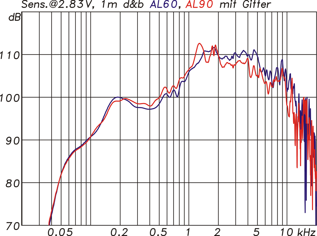 Der Hochtöner bringt es trotz seiner 16 Ω an 2,83 V auf 110 dB, die dann oberhalb von 5 kHz beginnen, langsam bis auf 100 dB zu fallen. Durch den größeren Abstrahlwinkel ist der Hochtöner der AL90 oberhalb von 2 kHz 1-2 dB leiser als der Hochtöner in der AL60. Umgekehrt ist die AL90 bei den tieferen Mitten ca. 1 dB lauter. Hauptgrund für die abweichende Sensitivity in den Mitten sind die unterschiedlichen Frequenzweichen für AL60/AL90. Die Messungen aus Abb. 2 erfolgten beide mit Gitter, was die leichte Welligkeit im Bereich von 2–10 kHz erklärt. Oberhalb von 10 kHz kommen dann auch Reflexionen innerhalb des Waveguides und Partialschwingungen der Hochtonmembran hinzu, die hier zu einem etwas unruhigen Verlauf führen, der sich in diesem Frequenzbereich jedoch im Höreindruck kaum oder gar nicht mehr bemerkbar macht.