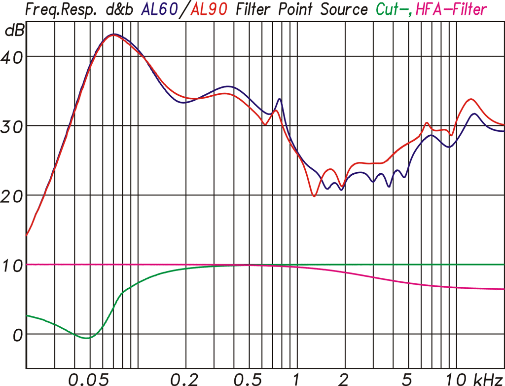 Filterfunktionen für die AL60 (blau) und AL90 (rot) im Point-Source-Modus. Unten das Low-Cut Filter (grün) und das HFA-Filter (magenta) (Abb. 3) (Bild: Anselm Goertz)