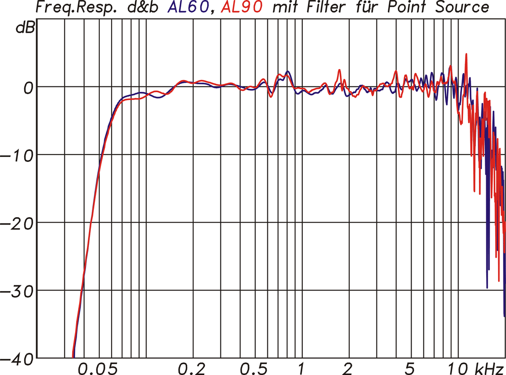 Frequenzgang der AL60 (blau) und AL90 (rot) im Point-Source-Modus mit Controller gemessen (Abb. 5) (Bild: Anselm Goertz)