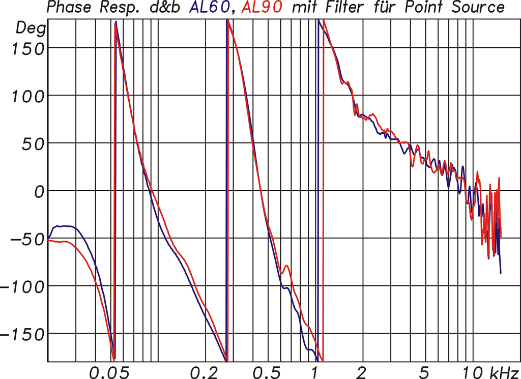 Phasengang der AL60 (blau) und AL90 (rot) im Point-Source-Modus mit Controller gemessen (Abb. (Bild: Anselm Goertz)
