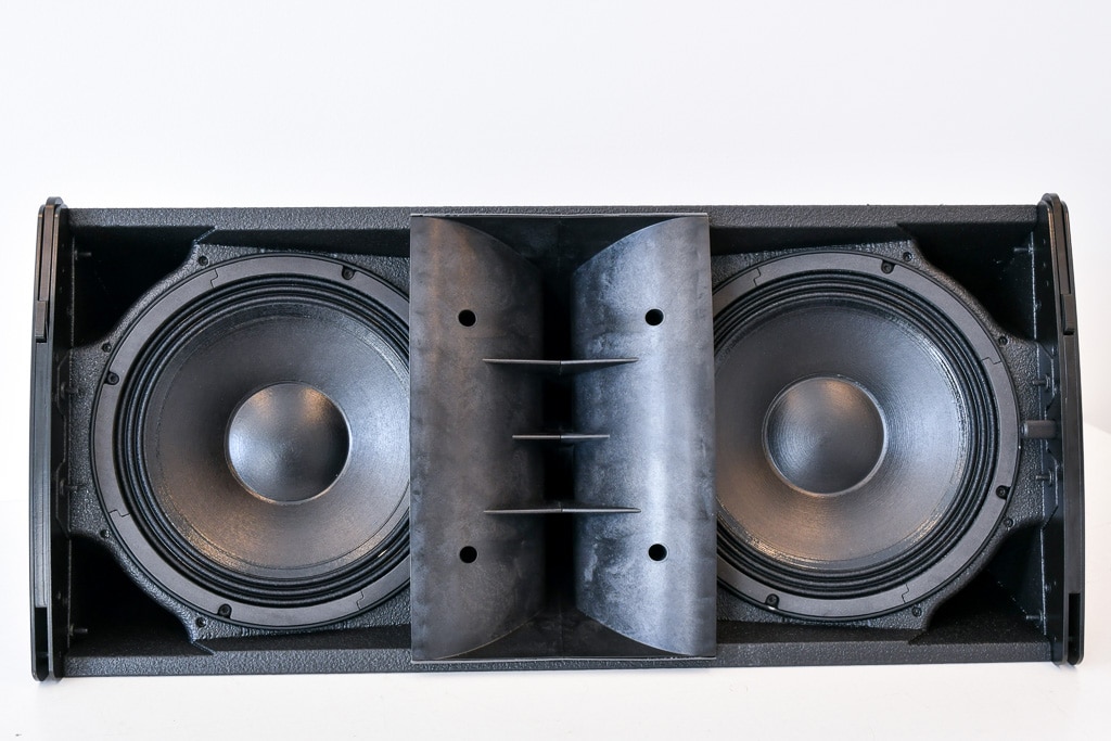 Ein Blick ins Innere zeigt zwei kräftige 10“-Neodymtreiber des italienischen Herstellers B&C und einen 1,4“-Kompressionstreiber mit Titanmembran, Neodymmagnet und einer 3“-Schwingspule. Typisch für d&b wird das 2-Wege-System passiv getrennt und aktiv equalized. Das passive Filternetzwerk wirkt daher nur als Hoch- bzw. Tiefpassfilter. Alles andere wird dem DSP in der Endstufe überlassen. Mit dieser Art der Filterung wird ein guter Kompromiss zwischen der in punkto Verstärker und Verkabelung aufwändigen, voll aktiven Betriebsart und einer meist ebenfalls mit viel Aufwand einhergehenden passiven Entzerrung erreicht. Die Bassreflextunnel des Gehäuses befinden sich in den vier Ecken der Frontplatte und sind außen wie innen mit Trompetenöffnungen und Rundungen versehen, die zur Reduzierung von Strömungsgeräuschen beitragen. Dämmmaterial gibt es in Form eine Schicht Basotect an der Gehäuserückwand. Der elektrische Anschluss mit Link-Ausgang erfolgt über Speakon-Chassis-Stecker und Buchsen aus der Serie NLT4. Auf Wunsch gibt es auch Standard-NL4 für beide Anschlüsse.