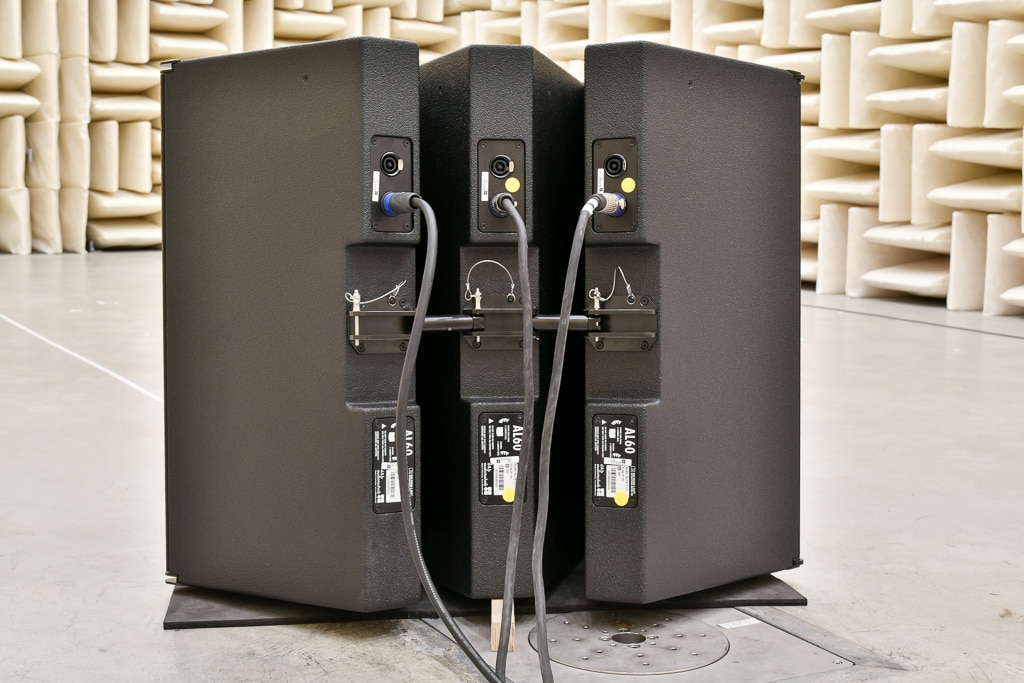 Für den Hörtest wurden zwei AL60 als Point Sources mit 30° × 60° im Stereo-Setup im reflexionsarmen Raum aufgebaut. Auch wenn dieser Raum nicht unbedingt „typisch“ ist, hat er jedoch den Vorteil, keinen Einfluss zu nehmen, so dass man den Lautsprecher pur hört, wie es sonst nur im Freien möglich ist. Bestimmte Eigenschaften wie das Richtverhalten oder klangliche Neutralität lassen sich so gut beurteilen, ohne dass man dazu den Einfluss eines Raums abstrahieren müsste. Ein weiterer Vorzug dieser akustisch „sterilen“ Umgebung ist die Vergleichbarkeit, da man immer exakt gleiche Randbedingungen bei den Hörtest hat. Schwierig wird es bei größeren Line-Arrays, da im hier genutzten Messraum mit maximal 8 m keine hinreichenden Entfernungen zwischen Lautsprecher und Zuhörer möglich sind.