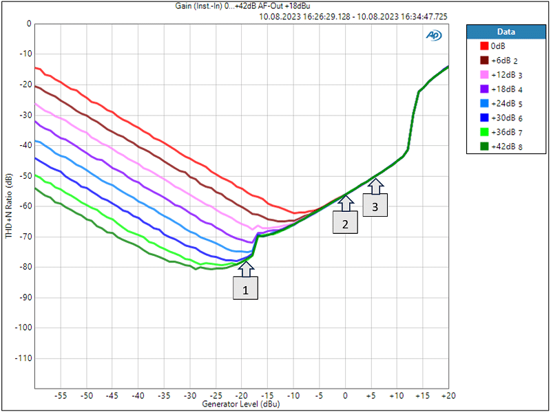 Abb. 7 verdeutlich mit den Kennlinien zwischen Eingangs- und Ausgangspegel die internen Zusammenhänge der Signalbearbeitung. Die rote Kurve mit einem eingestellten Gain von 0 dB, entsprechend einem über alles Gain von -20 dB, zeigt einen linearen Verlauf bis zu einem Eingangspegel von +12 dBu. Darüber hinaus beginnt die Eingangsstufe zunächst soft zu clippen und dann ab +15 dBu hart. Bei höheren Gain-Werten verschieben sich die Kurven entsprechend weiter nach oben bis zu dem Punkt, wo der Ausgangspegel auf mehr als die eingestellten +18 dBu steigen würde. Hier setzte ein Limiter ein, der das Signal unverzerrt begrenzt. Für die Einstellung mit +42 dB Gain tritt der Limiter dann ab einem Eingangspegel von -4 dBu in Aktion, wo dann bei einem realen Gain von +22 dB der maximale Ausgangspegel von +18 dBu erreicht wird.