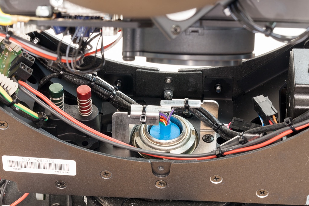 Eine Tabelle auf den Innenseiten der Schalen gibt Auskunft über die Steckverbinder und Belegung auf den Platinen. Weiterhin sind die symmetrisch passenden Abdeckungen mittels Buchstaben ihrer Seite zuzuordnen. Sehr schön ist für den Service die ausgefeilte Arretierung für Pan und Tilt im 90°-Winkel.