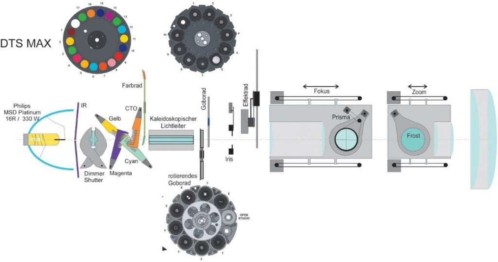 Das gebündelte Licht steht für die darauffolgende Optik an der Lightpipe zur Abbildung bereit. So werden zuerst die tragenden Elemente der Projektion, die rotierenden Gobos, von dem homogenen Licht durchflutet. Wie man an der Grafik erkennen kann, folgen den abbildungsgebenden Funktionen das statische Goborad, die Iris sowie das Effektrad. Erst dann folgt die Fokus-Optik. Insgesamt sind die abbildungsgebenden Optiken sehr aufwändig gestaltet.