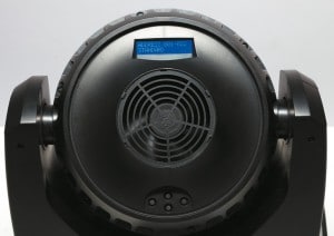 Die neunzehn LEDs lassen sich alle, im entsprechenden DMX-Modus betrieben, einzeln ansteuern. Sie sitzen auf einer motorisch verfahrbaren Einheit, die dadurch einen Zoombereich von minimal 11° bis maximal 58° ermöglichen soll; dies schafft die Zoom-Einheit des Helios+ 19Z bei voller Auslenkung übrigens in weniger als einer Sekunde. Umringt wird das Ganze, wie bereits erwähnt, von einem milchig mattweißen Leuchtband, dessen vier Teile mit jeweils zwei RGB-LEDs ausgestattet sind. Auch diese LEDs lassen sich in einem bestimmten DMX-Modus, von denen es insgesamt sechs an der Zahl gibt, separat ansteuern. Einstellungen, wie Pan / Tilt invert oder auch z. B. die verschiedenen Dimmerkurven können per DMX ferngesteuert werden – das umständliche Einstellen am Gerät kann man sich dadurch sparen. Zu Guter Letzt und ebenfalls im Kopf des Scheinwerfers untergebracht, sind das zweizeilige Display mit sechzehn Zeichen und die dazugehörigen Navigationstasten; das sind beim Helios+ 19Z vier Stück. Da diese Tasten, zumindest bei dem der Redaktion vorliegenden Gerät, nicht beschriftet sind, bedarf die Navigation durch das Gerätemenü anfangs ein wenig Übung. Auch macht es dieser Umstand nicht unbedingt einfacher, Einstellungen am Gerät bei laufendem Betrieb vorzunehmen. Hier kommt die Frage auf, ob es nicht vorteilhafter gewesen wäre, wenn Display und Navigationstasten ihren Platz an der Frontseite des Scheinwerfer-Basements gefunden hätten, die somit lediglich durch den Produktnamen geschmückt wird. Immerhin schaltet der Kopf auf „stur“ sobald man eine Taste doppelt betätigt, nach einiger Zeit der Nichtbetätigung, führt der Helios+ 19z dann die anliegenden DMX-Werte wieder aus. Von den Ausmaßen her wirkt das kopfbewegte LED-Multifunktions-Washlight sehr homogen, auch wenn das Basement im Vergleich zu anderen produktverwandten Geräten vielleicht etwas größer geraten ist. Im Gesamtbild wirken die Relationen jedoch stimmig und auch das Verhältnis zwischen Größe und Gewicht passt; denn bei den schmalen Eckdaten, zusammengefasst in einer Höhe von ca. 399 mm, einer Breite von ca. 320 mm und einer Tiefe von ca. 158 mm, ist das Gesamtgewicht von ca. 7,4 kg keineswegs überdimensioniert. Die Frischluftzufuhr des Helios+ 19Z erfolgt über ein intelligentes Belüftungssystem, das in vier unterschiedlichen Lüfter-Modi betrieben werden kann und das Gerät somit auch für Anwendungen infrage kommen lässt, bei denen eine minimale Geräuschkulisse unabdingbar ist.