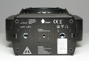 Das Basement des Helios+ 19Z beherbergt das elektronische Netzteil mit automatischer Spannungsregelung, welches in einem Bereich von 100–240 V AC bei 50/60 Hz für den ordnungsgemäßen Betrieb des Gerätes sorgt. Zudem sind an der rückwärtigen Seite, neben der Aufnahme für eine Feinsicherung, die Anschlüsse für die Spannungs- und Signalversorgung untergebracht. Letztere kann zum einen über sowohl als dreipolig- als auch als fünfpolig ausgeführte Neutrik-DMX-Steckverbindungen realisiert werden; zum anderen ist das Gerät mit einer Neutrik-EtherCon-Schnittstelle ausgestattet, durch die eine Ansteuerung über das ArtNet-Protokoll ermöglicht wird (ArtNet3). Dieser Anschluss ermöglicht beim Helios+ 19Z obendrein die praktische Funktion, den Scheinwerfer als ArtNet-Knoten zu verwenden, um beispielsweise das erste Gerät in einer Signalkette via ArtNet anzusteuern, die folgenden jedoch über die DMX-Anschlüsse mit Steuersignalen zu versorgen. Der Helios+ 19Z verfügt, neben einem PowerCon-IN- (blau), auch über einen PowerCon-OUT-Anschluss (weiß). Somit können auf Grund der niedrigen Leistungsaufnahme, die laut Hersteller mit maximal 350 VA angegeben ist, im Bereich der Spannungsversorgung bis zu zehn Geräte hintereinander verkettet und dadurch der Verkabelungsaufwand gering gehalten werden. Die Unterseite des Basements bietet zwei Quick-Lock-Aufnahmen zur Montage eines Omega-Bügels. Zudem kann die geflogene Anbringung des Scheinwerfers mit Hilfe eines M10 Innengewindes, das exakt in der Mitte der Bodenplatte platziert ist, vorgenommen werden. Gleich zwei fest mit dieser Bodenplatte verbundene Ösen sorgen für die Möglichkeit, das Gerät mit entsprechend dimensionierten Sicherungsseilen vorschriftsmäßig gegen Herabfallen zu sichern. Das Hauptaugenmerk des Ehrgeiz Helios+ 19Z liegt jedoch sicherlich auf der optischen Einheit, die im Kernstück des Kopfes (540° Pan- und 270° Tilt-Bereich) aus neunzehn 15 W „Osram Ostar“ RGBW-LEDs besteht. Diese leistungsstarken LED-Bausteine produzieren einen Lichtstrom von 7.600 Lumen und sind von Herstellerseite, wie heutzutage üblich, mit einer durchschnittlichen Lebensdauer von ca. 50.000 Stunden angegeben.