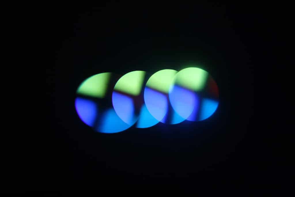 Direkt dahinter befinden sich die drei Flaggen, die für die CMY-Farbmischung zuständig sind, in der Anordnung YCM. Diese – für ein Gerät dieser Größe meist noch eher unübliche – Farbmischeinheit erzeugt erstaunlich lineare und satte Mischfarben, ohne dass etwaige Farbschatten oder Licht spiele außerhalb des abgebildeten Lichtkegels entstünden. Für schwer in einem sattem Ton auf subtraktive Art mischbare Farben steht ein Farbrad mit 13 Farben plus weiß zur Verfügung. Hierzu zählen unter anderem ein CTO-, CTB-, UVund ein Quad-Color-Filter. Letzterer ist viergeteilt in die Farben RGBY und macht auf den ersten Blick vielleicht nicht so viel Sinn, findet jedoch im Zusammenspiel zwischen einem der beiden bzw. beiden Prismen und der CMY-Farbmischung dann doch durchaus seine Daseinsberechtigung. Zudem bietet ein Color-Macro-Kanal eine Vielzahl von voreingestellten Mischfarben.