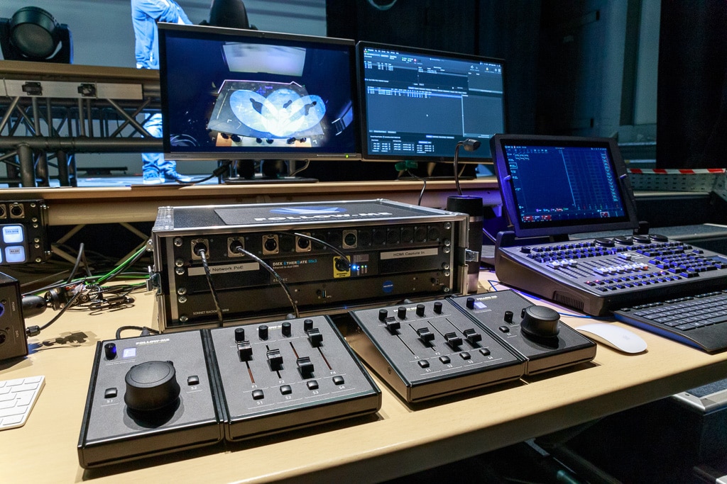 Die Zentrale des Systems liegt im hinten zu sehenden 19"-Rack, das neben den obligatorischen Patchfeldern einen Mac Mini, einen Switch, das USB-RS485-Interface, die SDI-Thunderbolt-Wandlerkarte sowie einen Artnet-DMX-Node beinhaltet